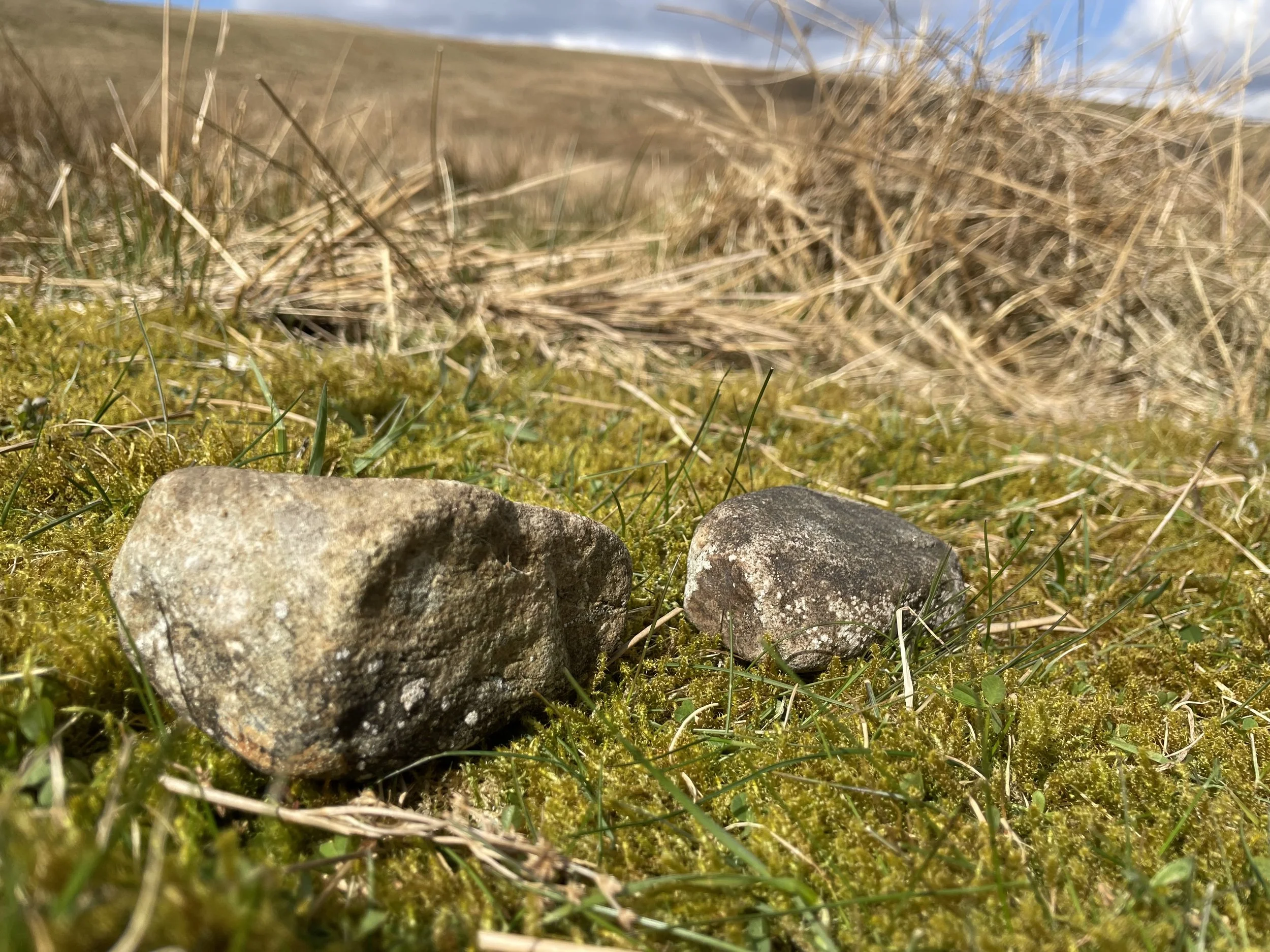 I felt the need to honour the place somehow - as a first-time visitor, not knowing the landscape... My ear was caught by a very tuneful stone in the river. I didn’t want to go too far off the road, partly because of time and also because of not wanting to disturb anyone. I found a mossy bank right where I was. With stones tucked into the moss it somehow felt appropriate to be soft and I welcomed being close to it. I didn’t have much time to ‘attune’ or settle. However, the combination of materials felt familiar, and it also felt okay simply to mark this moment with some sound-making that was familiar: ie circling with stone. I was marking the moment of my presence here; my intention to connect with and listen to the wildlife in its place. So even though this was a quicker process than last week it still felt meaningful and intentional.